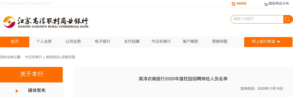 【2026江苏南京市高淳农商银行校园招聘体检人员名单 进入阅读模式】相关岗位: